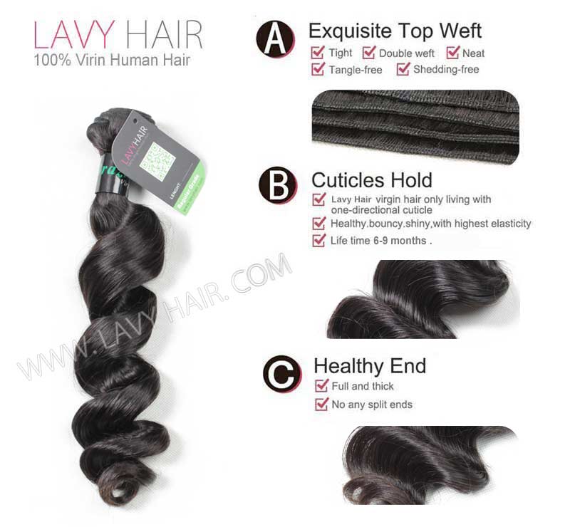 Lavy hair extension is using double weft only. It is strong with good constructed, very tight and neat. Line is soft and strong,comfortable to wear 5-line reinforcement stitching to secure hair ,free from shedding. The material is using finest natural and healthy young girl virgin hair, never colored. It keeps cuticles in the same direction, full cuticle durable, true to Length, thickness bottom, no frizzy, no dry end, no coarse, no brittle.