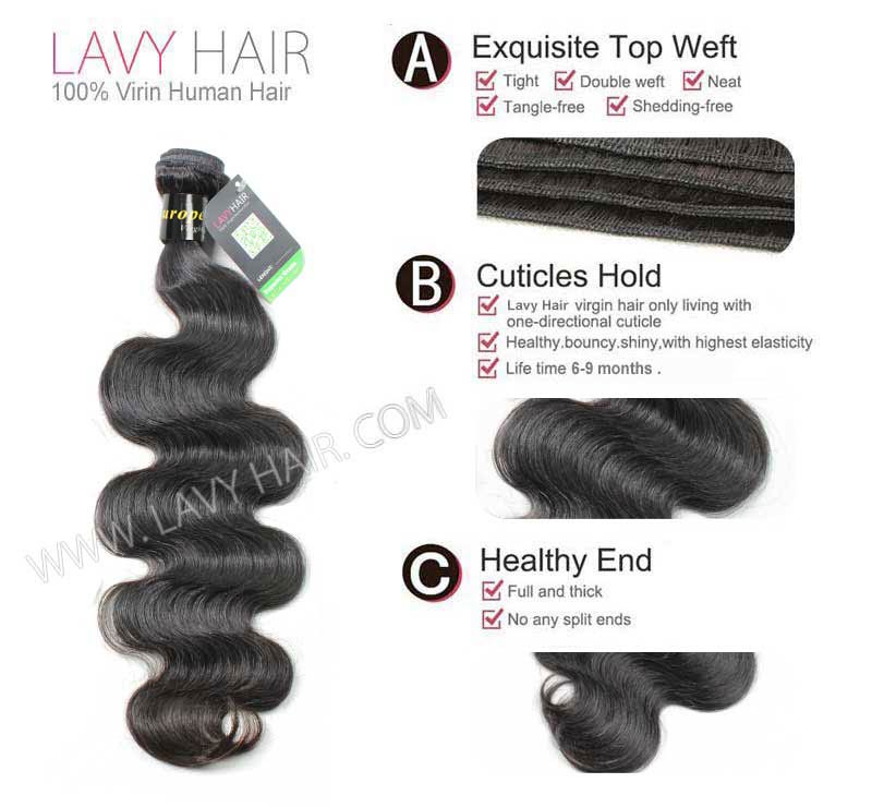 Lavy hair extension is using double weft only. It is strong with good constructed, very tight and neat. Line is soft and strong,comfortable to wear 5-line reinforcement stitching to secure hair ,free from shedding. The material is using finest natural and healthy young girl virgin hair, never colored. It keeps cuticles in the same direction, full cuticle durable, true to Length, thickness bottom, no frizzy, no dry end, no coarse, no brittle.