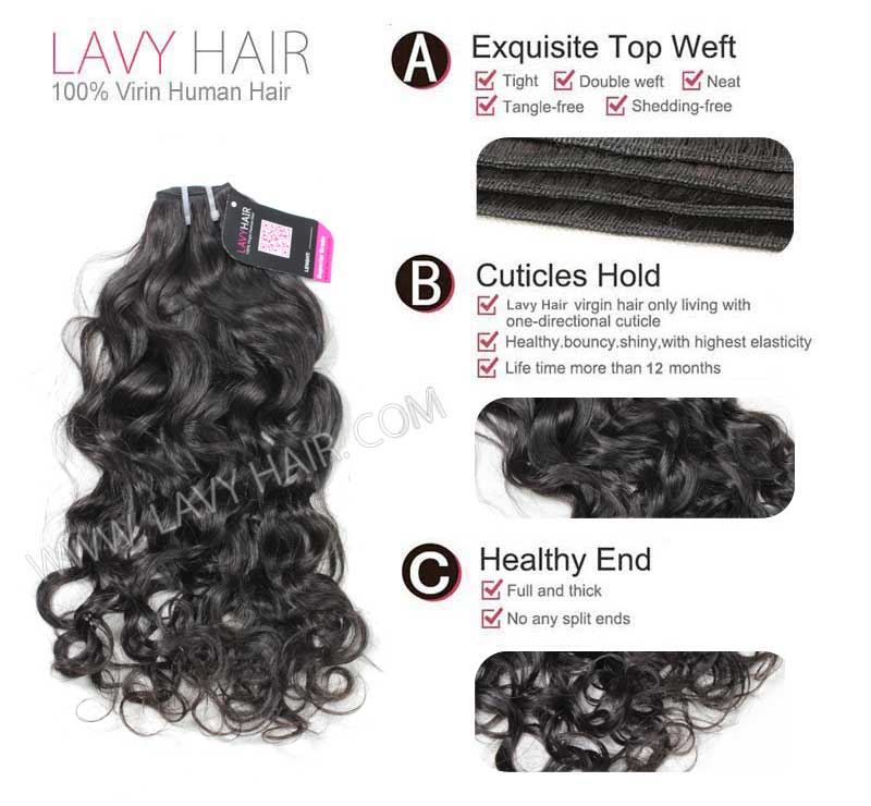 Lavy hair extension is using double weft only. It is strong with good constructed, very tight and neat. Line is soft and strong,comfortable to wear 5-line reinforcement stitching to secure hair ,free from shedding. The material is using finest natural and healthy young girl virgin hair, never colored. It keeps cuticles in the same direction, full cuticle durable, true to Length, thickness bottom, no frizzy, no dry end, no coarse, no brittle.